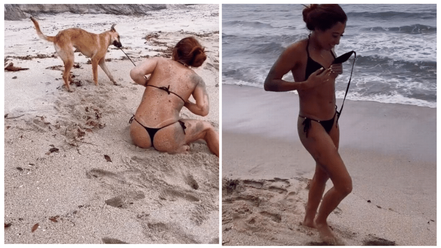 A tiktoker Daniela Henao Salgado estava passando um dia na praia com uma amiga quando uma cadelinha caramelo começou a brincar com as alças de seu biquíni e quase provocou um “topless forçado”.