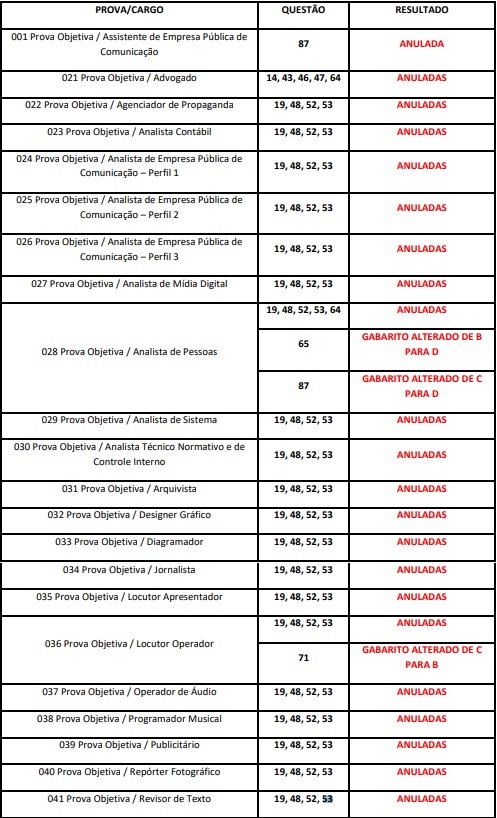 A Fundação Vunesp divulgou os resultados dos recursos contra gabaritos das provas objetivas do concurso da Empresa Paraibana de Comunicação (EPC). Conforme o documento, 90 questões de provas para 22 funções foram anuladas ou tiveram os gabaritos alterados.