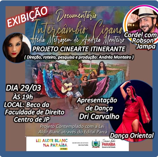 O Cinearte Itinerante, projeto de continuidade do documentário Intercâmbio Cigano, contemplado em edital da Lei Aldir Blanc –Paraíba, apresenta sua primeira exibição ao público como projeto de continuidade. A exibição acontece no próximo dia 29, a partir das 19h, no Beco da Faculdade de Direito, no Centro de João Pessoa. A entrada é gratuita