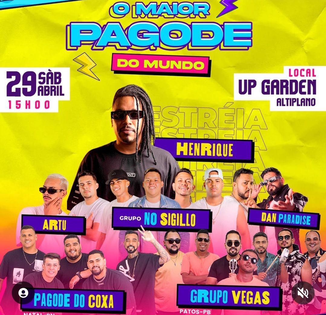 Com 5 atrações e mais de 12 horas de festa, a cidade de João Pessoa recebe no dia 29 de abril a partir das 15h, o evento ” O Maior Pagode do Mundo”.