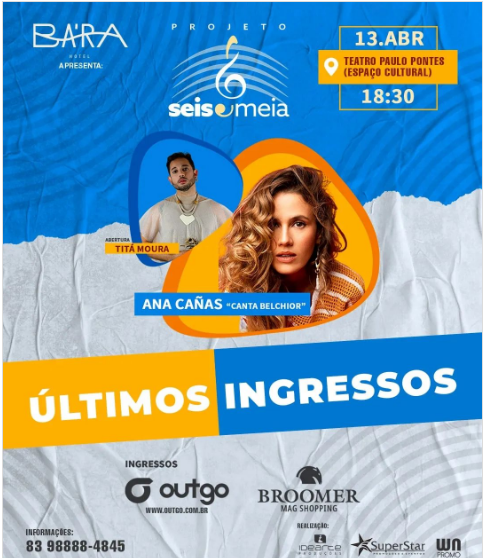 Além da cantora e compositora, o Projeto Seis & Meia do dia 13, conta com o show de abertura do artista paraibano Titá Moura que leva poesia e musicalidade.